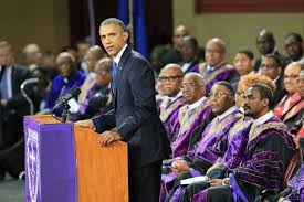 In contrast, however, African-American church pastors of that era seemed to occupy an artificially exalted position, an odd hybrid of corporate bigwig and tribal chieftain. I remember one pastor who strutted about the pulpit wearing these impossibly shiny, sharkskin suits, looking more like a member of the Motown group, The Temptations than a humble man of God. Later, black preachers began to wear elaborate robes, of varying colors and trimmed in velvet, or braided cords of red or gold. During afternoon services where several congregations might come together these men would sit in ostentatious alignment before their combined congregations reminding me, even at that young age of the ill-tempered, aging peacocks that made a habit of tormenting the children at the Deming Park Zoo. This image from the memorial service for Charleston, South Carolina church shooting victim, Pastor Clementa Pinckney, with a dozen or so of these similarly outfitted individuals providing an alarmingly familiar backdrop for the President as he delivered the eulogy.